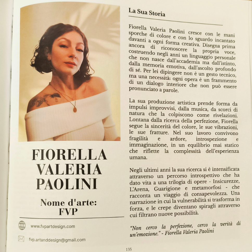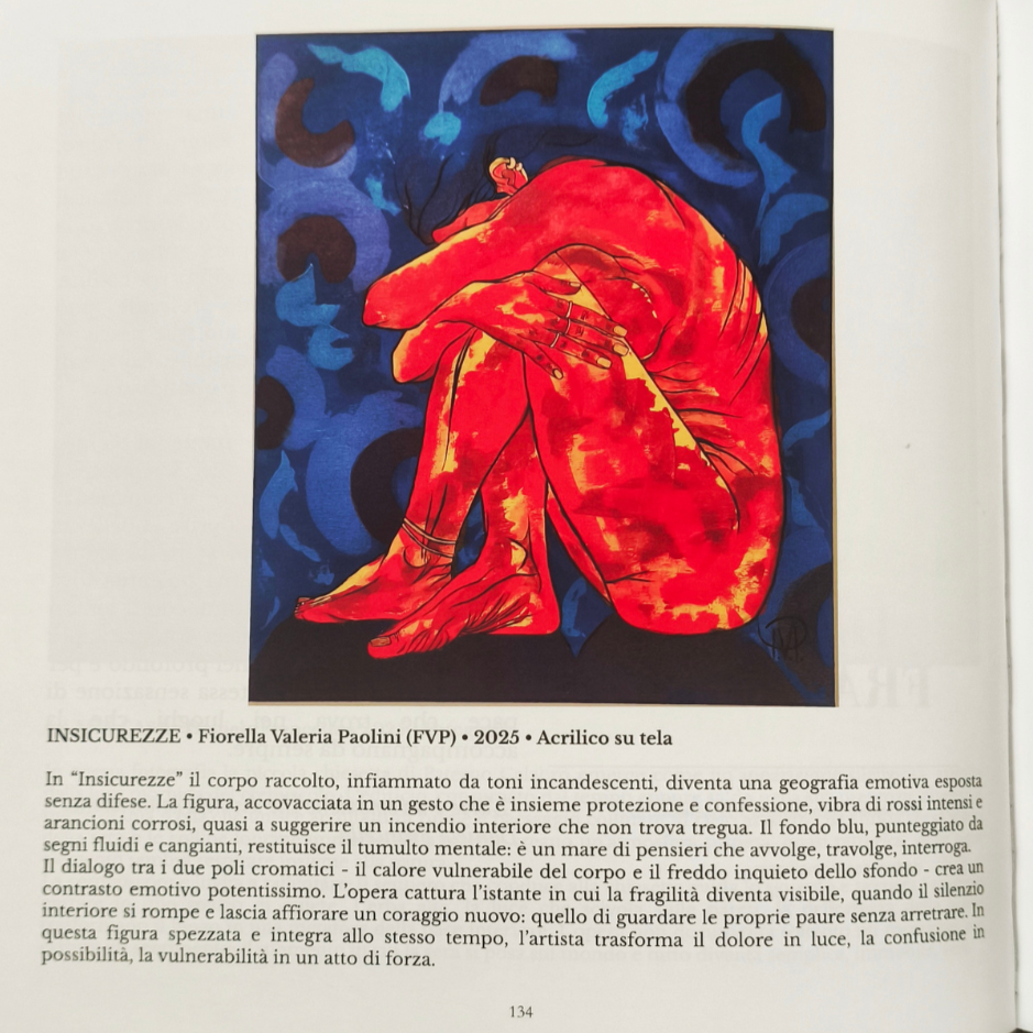 L'opera scelta per il volume è Insicurezze (2025, acrilico su tela) — parte di una trilogia insieme a L'Arena e Guarigione e metamorfosi. Un percorso che va dalla vulnerabilità al ritrovamento della forza, dove il corpo diventa messaggio e il colore diventa linguaggio.